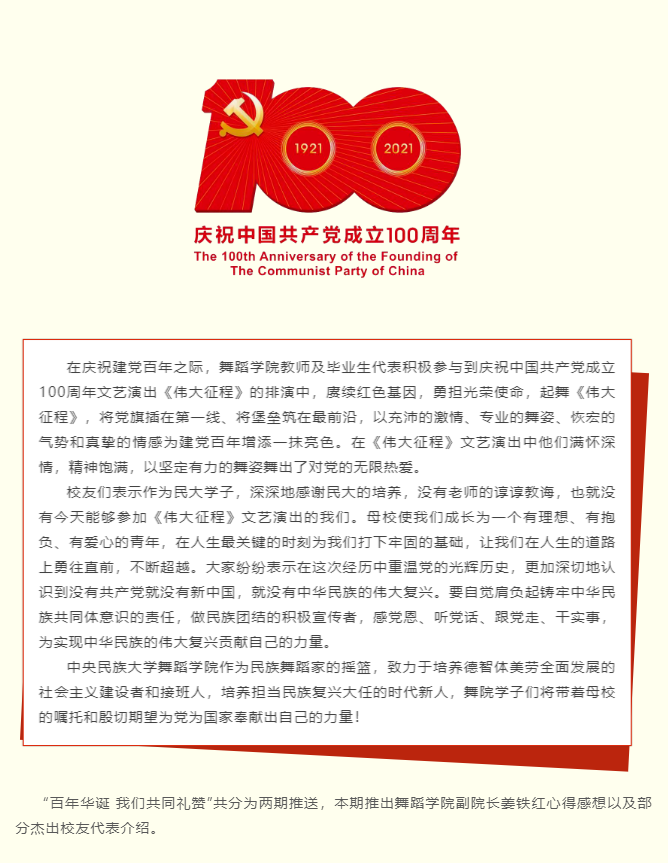 今年有幸受邀参与了庆祝中国共产党成立100周年文艺演出《伟大征程》的节目编创,能够有机会在这样重大的演出中贡献力量是我一生的荣光。通过亲历这样的高光时刻,我的精神受到了一次深刻的洗礼,我深刻了解了党这100年来艰苦卓绝的奋斗史,深刻体会到了党带领全国人民走进新时代,实现全面小康伟大征程的不易,更加强化了永远跟党走,永远感恩党,为国家的繁荣昌盛拼搏努力的坚定信念。