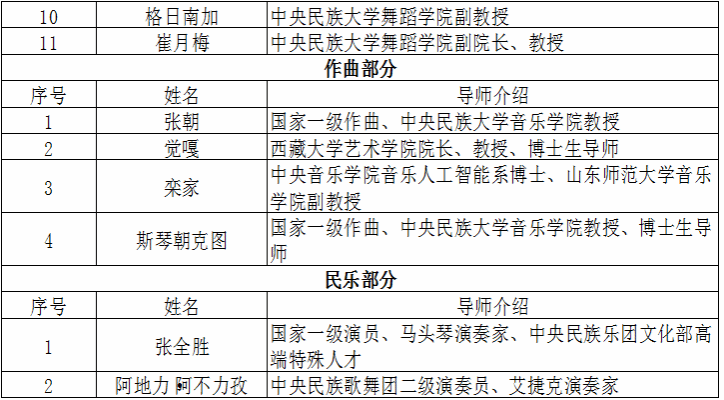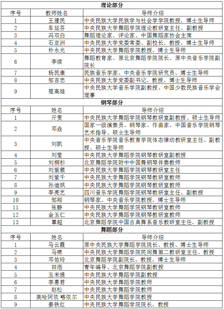 、四川音乐学院、中央民族歌舞团、中央民族乐团、中国舞蹈家协会、中国音乐家协会等高校、团体、协会的专业师资,组建了由权威音乐理论家、钢琴演奏家、舞蹈教育家、舞蹈理论家、民族音乐作曲家联手打造的强大教学团队,致力于培养高质量的民族舞蹈钢琴艺术指导专业人才。