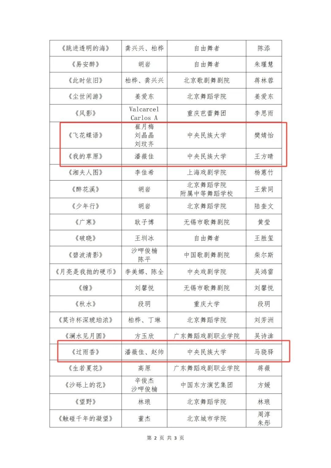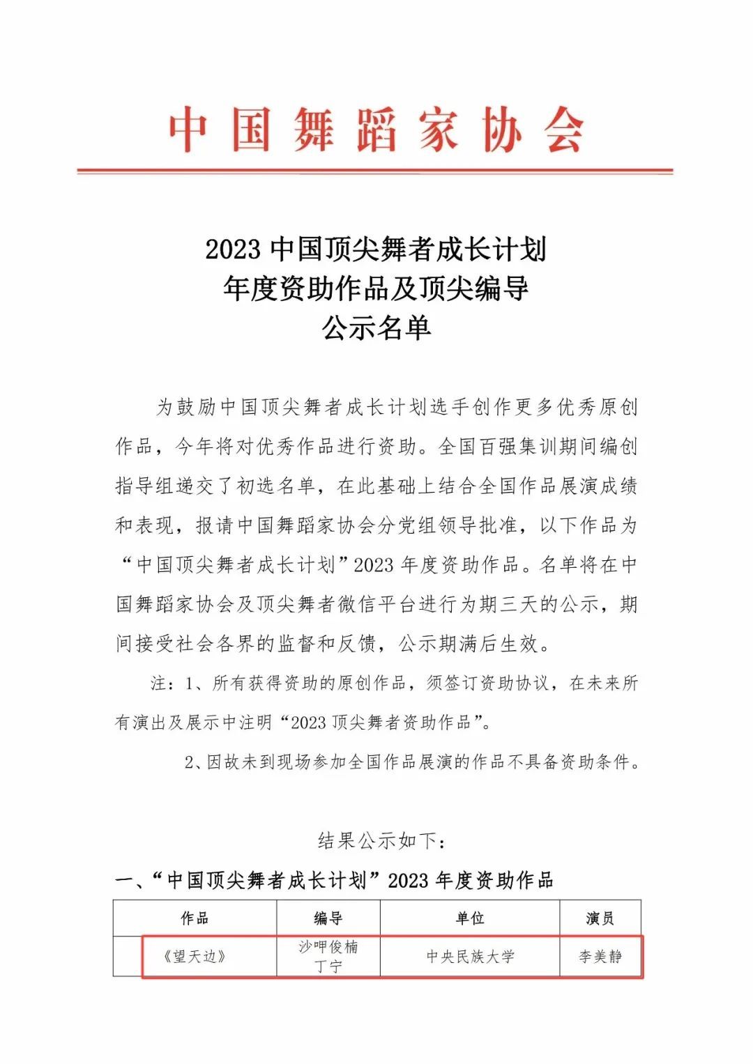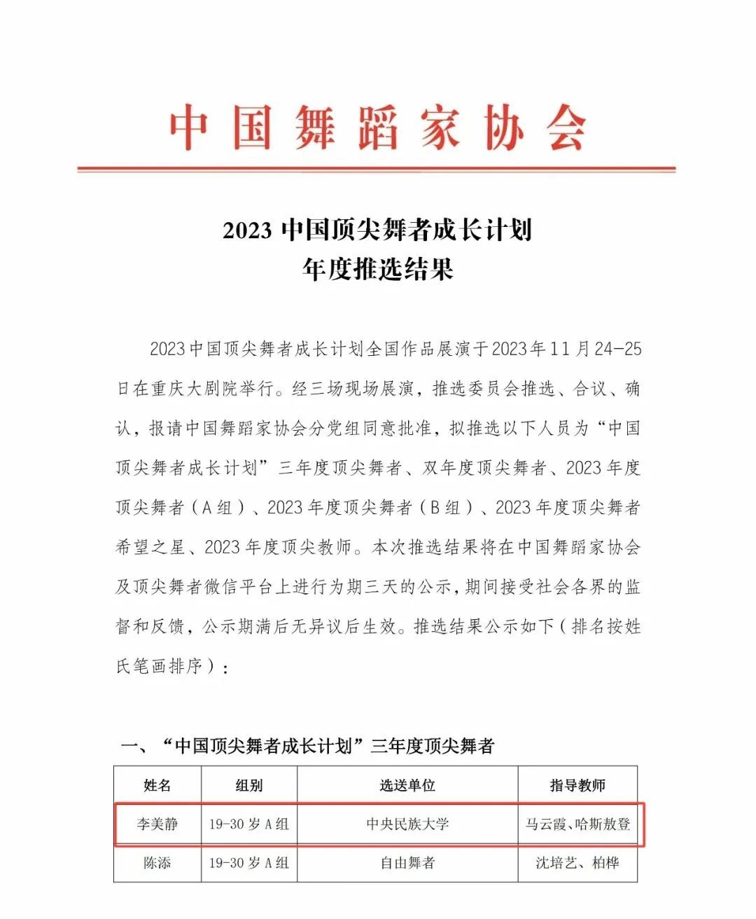 师生取得丰硕佳绩。学院青年教师李美静被评为“中国顶尖舞者成长计划”三年度顶尖舞者;2021级硕士研究生王方晴、樊婧怡和2020级表演本科生程靖茹被评为“中国顶尖舞者成长计划”2023年度顶尖舞者;院长姜铁红、青年教师苏娅菲,及2022级研究生陈平被评为“中国顶尖舞者成长计划”2023年度顶尖教师;副院长崔月梅、青年教师潘薇佳、马亮亮、贾志鹏,及2014级研究生刘晶晶、2020级研究生刘玟齐、2022级研究生陈平被评为“中国顶尖舞者成长计划”2023年度顶尖编导;学院选送的作品《望天边》、《飞花蝶语》、《我的草原》、《过雨香》被评为“中国顶尖舞者成长计划”2023年度资助作品。师生所获的诸多殊荣,体现了学院秉承以顶尖理念打造舞蹈人才、以匠心精神打磨优质作品、以创新发展推动师生共创共荣的精神。