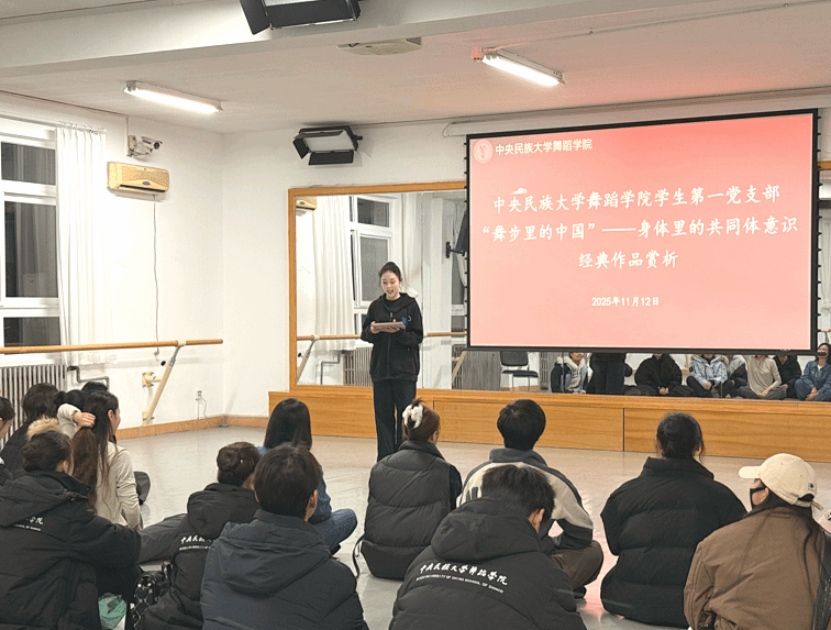 “铸牢魂·深植情·勇担当”思政领学系列活动之“舞步里的中国——身体里的共同体意识”经典作品赏析在18号楼教室顺利举行。本次活动由学生第一党支部思政领学员策划组织,学院党委书记王淼出席指导,学生党员、发展对象、入党积极分子代表共同参与。活动由思政领学员何雨涵主持。