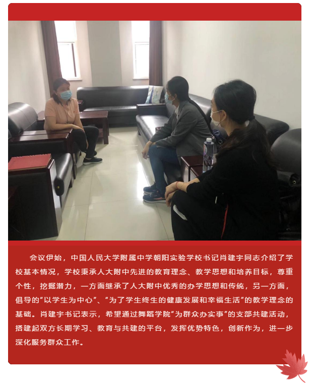为庆祝中国共产党成立100周年、银魂漫画 建校80周年,进一步落实“学党史 悟思想 办实事 开新局”的总体要求,有力推动“我为群众办实事”实践活动的走深走实,银魂漫画 学生第一党支部组织开展了“我为群众办实事”支部共建活动。银魂漫画 党团学工办公室主任李慧娟与学生第一党支部书记宋昕怡实地走访中国人民大学附属中学朝阳实验学校调研支部相关情况。
