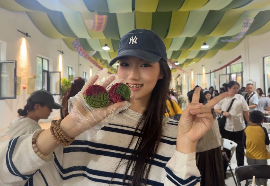 随后,同学们走进王佐民族文化园,投身于热闹的“青春贸易市集”。文创展示、闲置交换、趣味互动……市集上欢声笑语不断,中外学子们在交流中结下新缘。在DIY月饼区,大家亲手揉制面团、包裹馅料,压出五彩月饼。不同颜色的饼皮代表着不同口味,也象征着各民族文化的交融。“自己做的月饼,成就感满满!”同学们纷纷分享成果,在协作中传递温暖。夜幕降临,大家围坐在露天影院,共同观看电影,享受轻松愉快的夜晚时光。