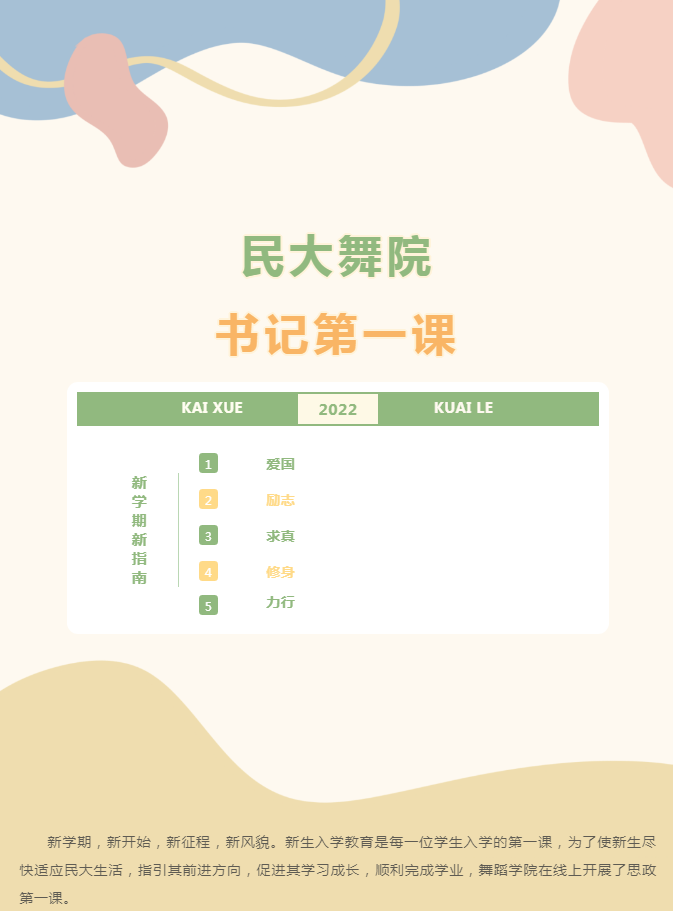 新生入学第一节思政课的开讲,意味着大家正式加入了民大舞院的大家庭,也意味着每个人都开启了一段崭新的旅程,愿大家在民大舞院都可以绽放出属于自己的绚丽花朵,舞出多彩的人生!