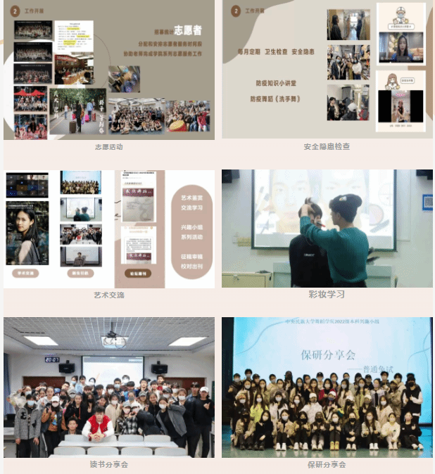 研究生会认真做好各项工作,提升服务质量。一、日常工作开展,包括招募志愿者、每月定期检查卫生与安全隐患、传播防疫知识等;二、信息物资共享,为各部门、各方面工作顺利开展,实现信息资源的同步共享;三、创新工作方式方法。创新服务手段,开创云端信息栏,纳入活动新闻、生活指导、志愿通道、意见信息等;创新考核机制,利用匿名考核公平的考察部员的工作态度等;四、举办兴趣小组活动,不断开展艺术鉴赏会和兴趣小组,交流保研考研、彩妆学习、创新创业的经验,举办读书分享会等活动。