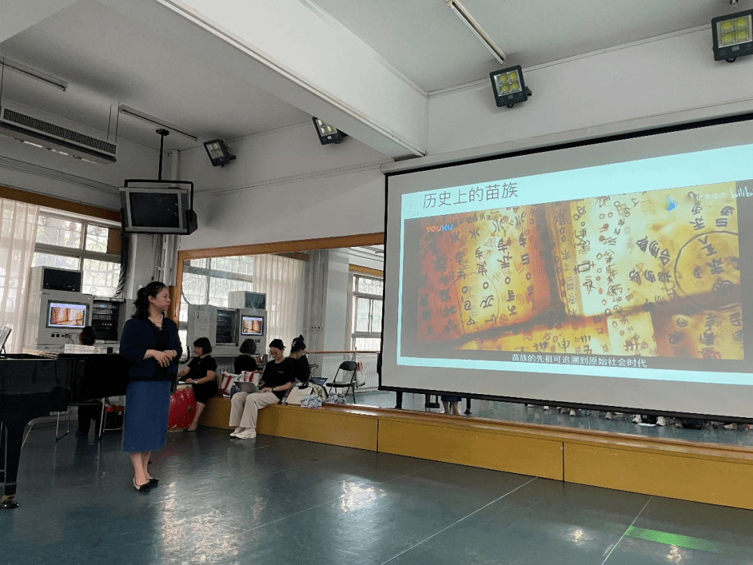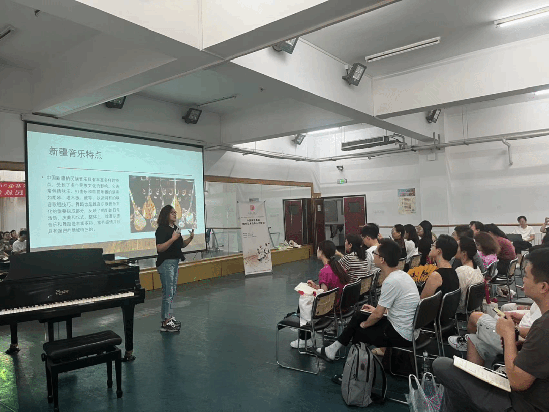附中的洪袁元老师授课。她讲授了云南花灯、东北秧歌、安徽花鼓灯和山东秧歌四类汉族舞蹈的钢琴伴奏。洪袁元老师指出汉族舞蹈中云南花灯和安徽花鼓灯,可分别从花灯戏和黄梅戏中提取元素,找寻民间音乐之韵味,为学员们寻找创作素材提供了重要的指导。