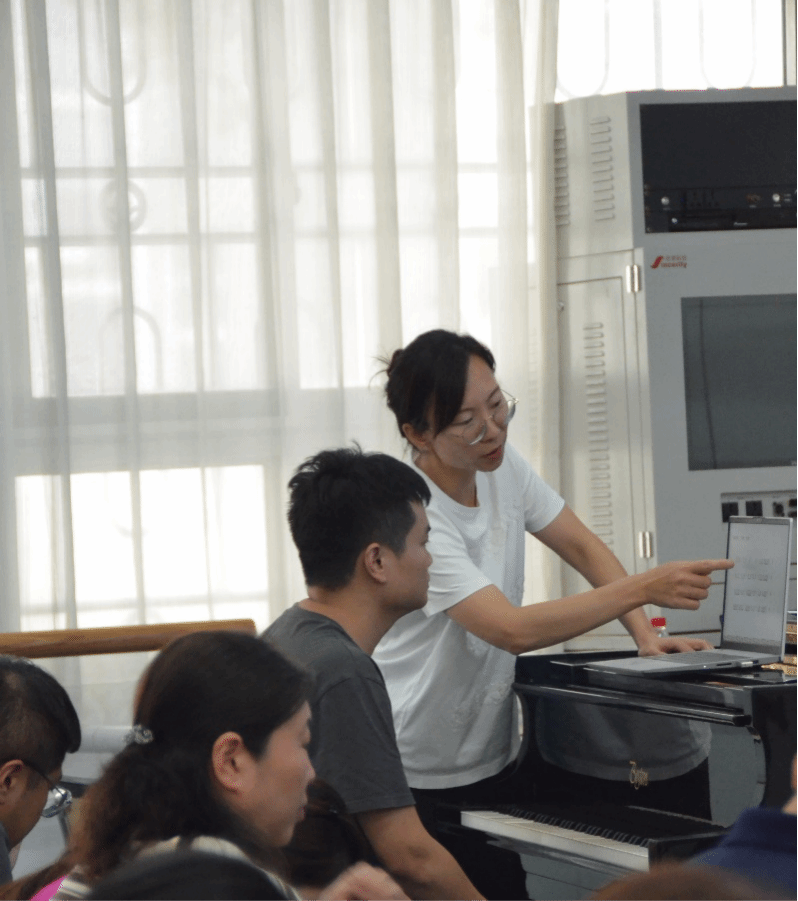 傣族板块中,刘莹老师从傣族人民温婉柔和的民族性格出发,讲授了傣族舞蹈音乐的特征,着重分析了傣族舞蹈课堂上基础性、风格性与表演性组合的不同内容,并通过弹奏向学员们示范讲解了傣族舞蹈音乐的触键方式及音乐表演力等。