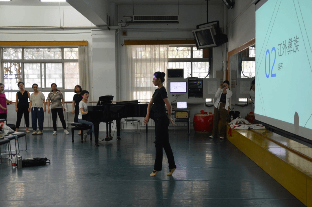 蒙古族板块中,亓雯老师结合个人采风经历和弹奏经验讲授了蒙古族舞蹈伴奏音乐的编创技法,分析了硬腕、绕肩、筷子舞、马步等组合的音乐特征,并与姜铁红教授合作示范了蒙古族舞蹈课堂训练中动作与音乐的配合,学员们也通过学习动作收获了对蒙古族舞蹈的身体感知。