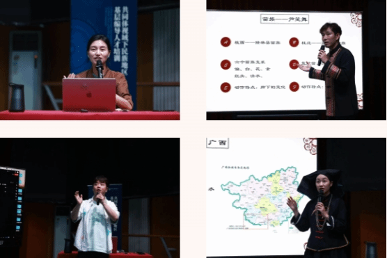 学员李虹(汉族)、李卓果(壮族)、杨佳林(汉族)是来自广西地区的三位舞蹈创作者, 以“八桂大地,歌舞飞扬”为主题着重分享广西的多元民族文化。分享内容包括壮族的花山壁画、扁担舞,桂北、桂西的苗族舞蹈,瑶族的花棍舞、皮鼓舞,毛南族傩舞,以及京族的非物质文化遗产哈节。并对侗族和苗族的芦笙舞动律进行区分,现场展示了壮族的扁担舞。
