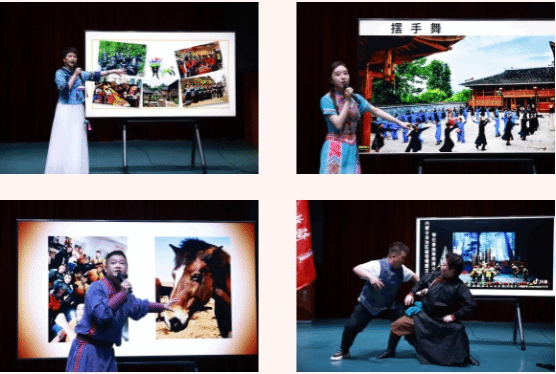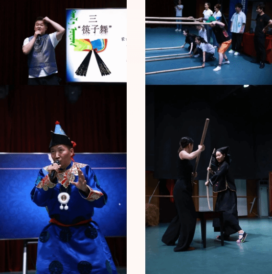 学员敖苏利(达斡尔族)对东北三少民族,鄂温克族、达斡尔族、鄂伦春族的民间舞蹈与民族特色生活场景进行分享,并展示萨满鼓舞的打法。学员伊敏(鄂温克族)着重介绍呼伦贝尔大草原的鄂温克族,讲解这一民族的传统舞蹈与节气文化。学员乌哈图(蒙古族)主要讲述鄂尔多斯的筷子舞,以及该舞蹈所表演的空间场域和文化形态,并现场展示筷子舞。学员徐小平(汉族)向大家分享了自己的历时两年创作的荷花奖作品《马铃儿摇响幸福歌》在创作背后的故事,创作者的讲解使大家对作品中蒙古马精神和走马形态的刻画以及人与马、人与人的温情故事有了更深刻的感受。